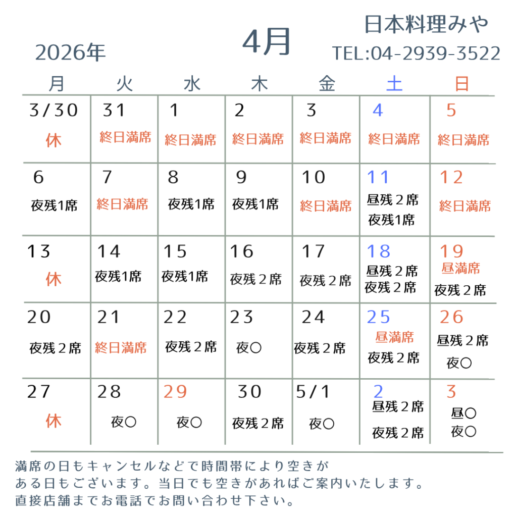 四月のご予約、心よりお待ち申し上げております。